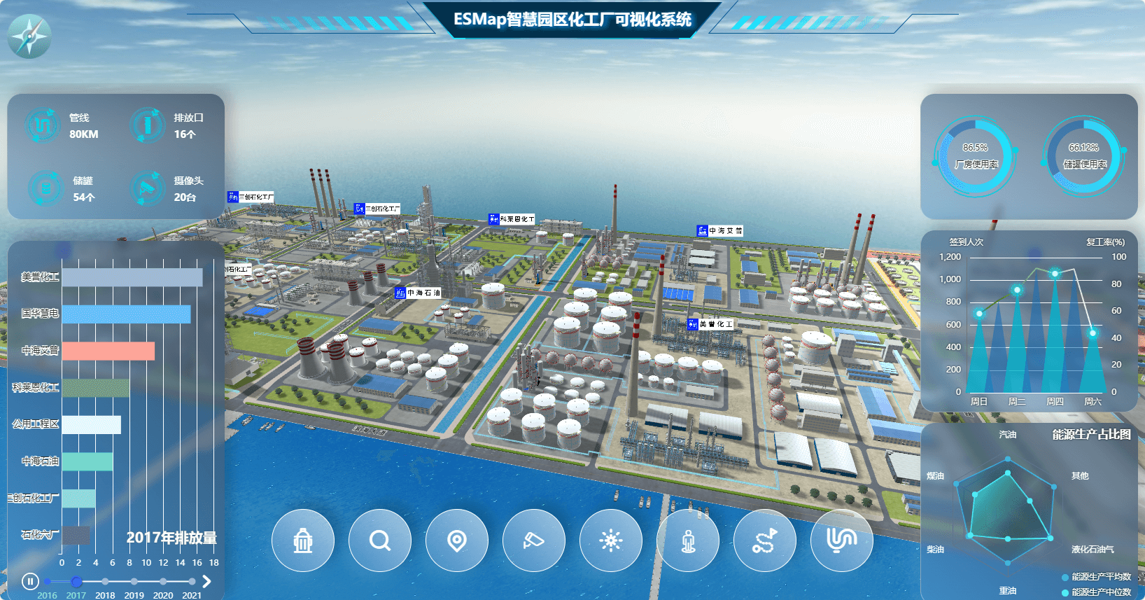 提供丰富的定制化设计图表,对生产运营数据进行图表可视化表达;支持基于数据的场景化特效表达,提供场景可视化效果呈现;