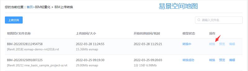 平台有专门的上传通道,在“室内三维场景”下方找到“BIM轻量化”,选择“BIM上传转化”,点击“上传文件”,文件格式支持:rvt(<=Revit 2021版本)、ifc(IFC2x3和IFC4版本)。