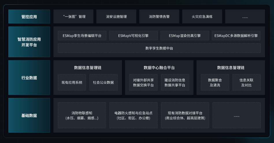 ESMap 智慧消防解决方案采用 "感知层 - 传输层 - 平台层 - 应用层" 四层技术架构,通过数字孪生 + 物联网技术整合多源消防数据与智能分析平台,实现从数据采集到应急处置的全流程智能化管理: