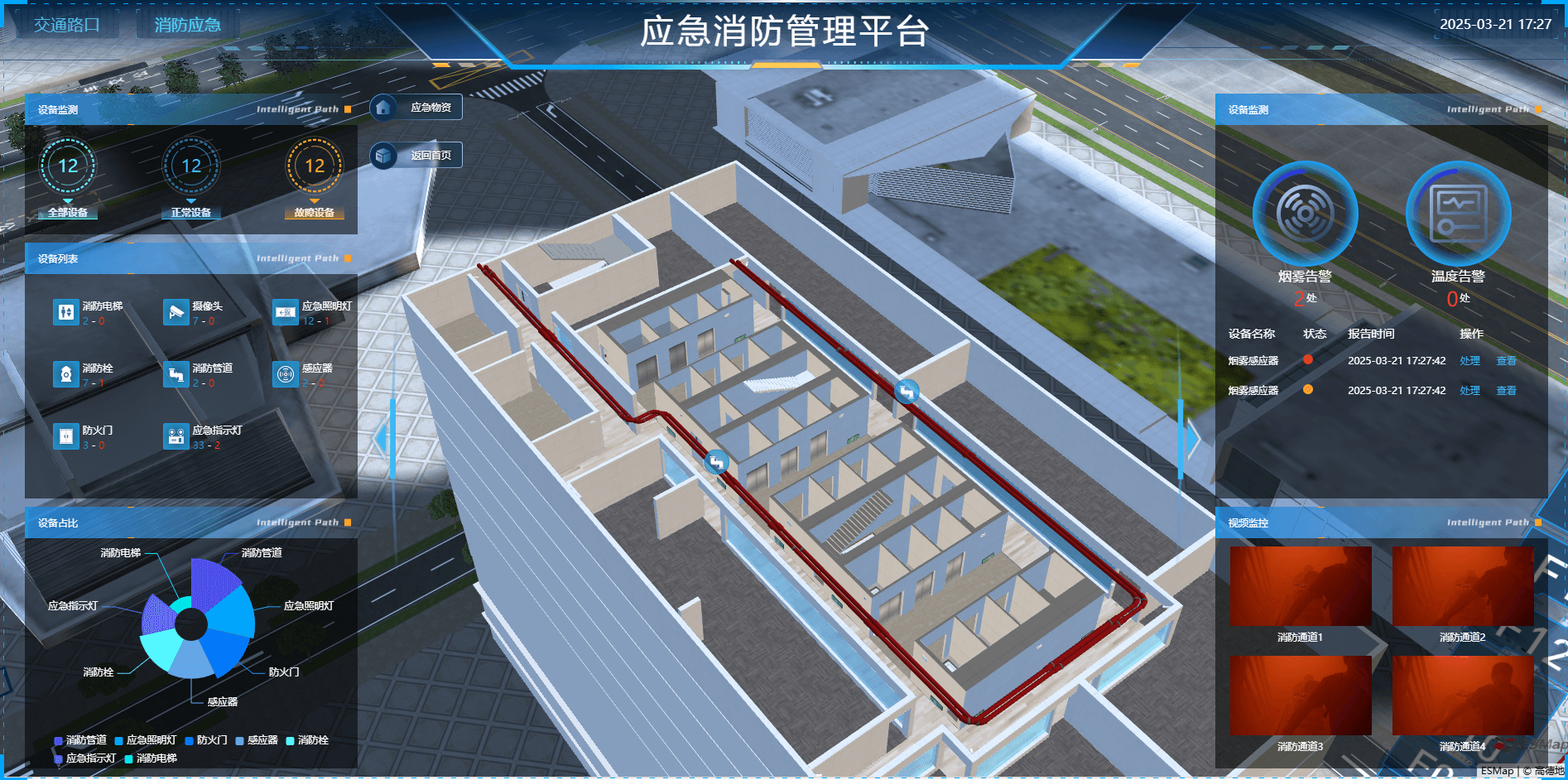 • 设施位置管理:场景定位各类消防设施的位置、分布和线路,如水泵、室内外消防栓、防排烟设施